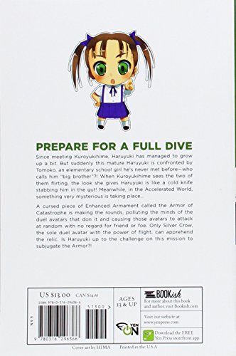 Details: Product Description Since meeting Kuroyukihime, Haruyuki has managed to grow up a bit. But suddenly this mature Haruyuki is confronted by Tomoko, an elementary school girl he's never met before--who calls him "big brother"?! When Kuroyukihime sees the two of them flirting, the look she gives Haruyuki is like a cold knife stabbing him in the gut! Meanwhile, in the Accelerated World, something very mysterious is taking place... A cursed piece of Enhanced Armament called the Armor of Catastrophe is making the rounds, polluting the minds of the duel avatars that don it and causing those avatars to attack at random with no regard for friend or foe. Only Silver Crow, the sole duel avatar with the power of flight, can apprehend the relic. Is Haruyuki up to the challenge on this mission to subjugate the Armor?! About the Author Reki Kawahara is an award winning author best known for his light novel series, Sword Art Online and Accel World.