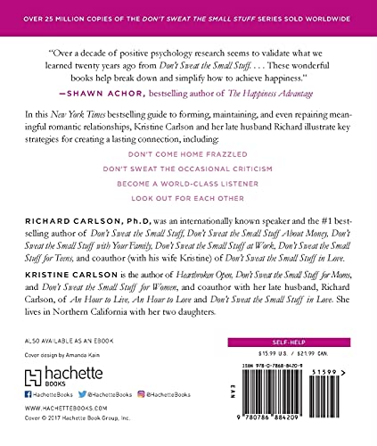 Details: Product Description Featured in Don't Sweat the Small Stuff: The Kristine Carlson Story starring Heather Locklear, premiering on Lifetime Form, maintain, and repair meaningful romantic relationships and feel like newlyweds every day with this simple, stress-free approach to love. He's helped 12 million people reduce the stress at home and at work with the #1 New York Times bestselling author of Don't Sweat the Small Stuff. With this companion book, Richard Carlson partnered with Kristine, his wife of fourteen years, to create an easy, stress-free way to enhance personal relationships. While depression, heartache, and anger are associated with love relationships, stress is rarely identified as a problem. Yet stress is often a factor in failing relationships. In these one hundred brief, beautifully written essays, the authors show readers how not to overreact to a loved one's criticism, how to appreciate your spouse in new ways, how to get past old angers, and many other ways to improve and increase the joy and pleasure that can and should be part of any relationship. Richard and Kristine Carlson illustrate key strategies for creating a lasting connection, including: Don't come home frazzled Don't sweat the occasional criticism Become a world-class listener Look out for each other Review Praise for Don't Sweat the Small Stuff: "Over a decade of positive psychology research seems to validate what we learned twenty years ago from Don't Sweat the Small Stuff. . . . These wonderful books help break down and simplify how to achieve that happiness." ― ShawnAchor, bestselling author of The Happiness Advantage "After almost two decades since the original release of Don't Sweat the Small Stuff, Richard Carlson's insights on the meaning of life continue to be timeless. The book teaches us to focus on the 'now' and find balance by living through contentment."― Deepak Chopra " Don't Sweat the Small Stuff has the power to change our individual and collective lives. I am deeply grateful to Dr. Richard Carlson and his beloved wife Kristine for their wisdom and compassion in bringing transformational practices and perspectives to millions of readers."― ShaunaShapiro, author of The Art and Science of Mindfulness "Richard Carlson caused a revolution in all our thinking with his Don't Sweat the Small Stuff books. He was like a Zen master in disguise, taking almost an aw-shucks attitude toward shifting the culture."― MarianneWilliamson, New York Times bestselling author of A Return to Love About the Author During his life, Richard Carlson, Ph.D, was considered one of the foremost experts in happiness and stress reduction in the United States and around the world and was a frequent featured guest on many national television and radio programs. Don't Sweat the Small Stuff continued to be a publishing phenomenon with over twenty titles in the brand franchise, two of which were co-authored and authored with his beloved wife, Kris. He died of a pulmonary embolism in December 2006, at the age of forty-five.